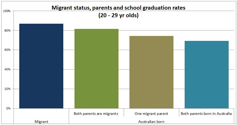 Interestingly, however, this effect endures beyond the first generation. According to Census 2011 data, people born in Australia to two migrant parents are 18% more likely to complete high school than Australians with non-migrant parents. Those with one migrant parent are 8% more likely (this appears to be the case regardless of whether the migrant is the mother or father).
